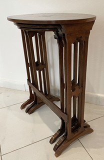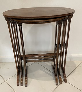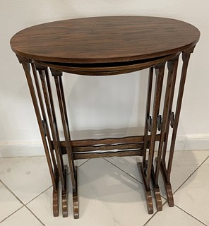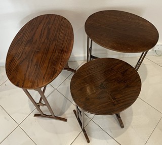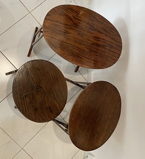 Evropa 1880 - 1930. Dubová dýha a masiv. Největší stolek: výška 64 cm, rozměr desky 52 cm x 34,5 cm. Prostřední stolek: výška 62 cm, rozměr desky 44 cm x 32,5 cm. Nejmenší stolek: výška 60 cm, rozměr desky 36 cm x 30,5. Tři do sebe zapadající stolky, tzv. hnízdové. Oválná horní deska. Postranní ploché sloupky spojené v zadní části příčkou. Klenutá podstava. V použitém stavu.