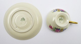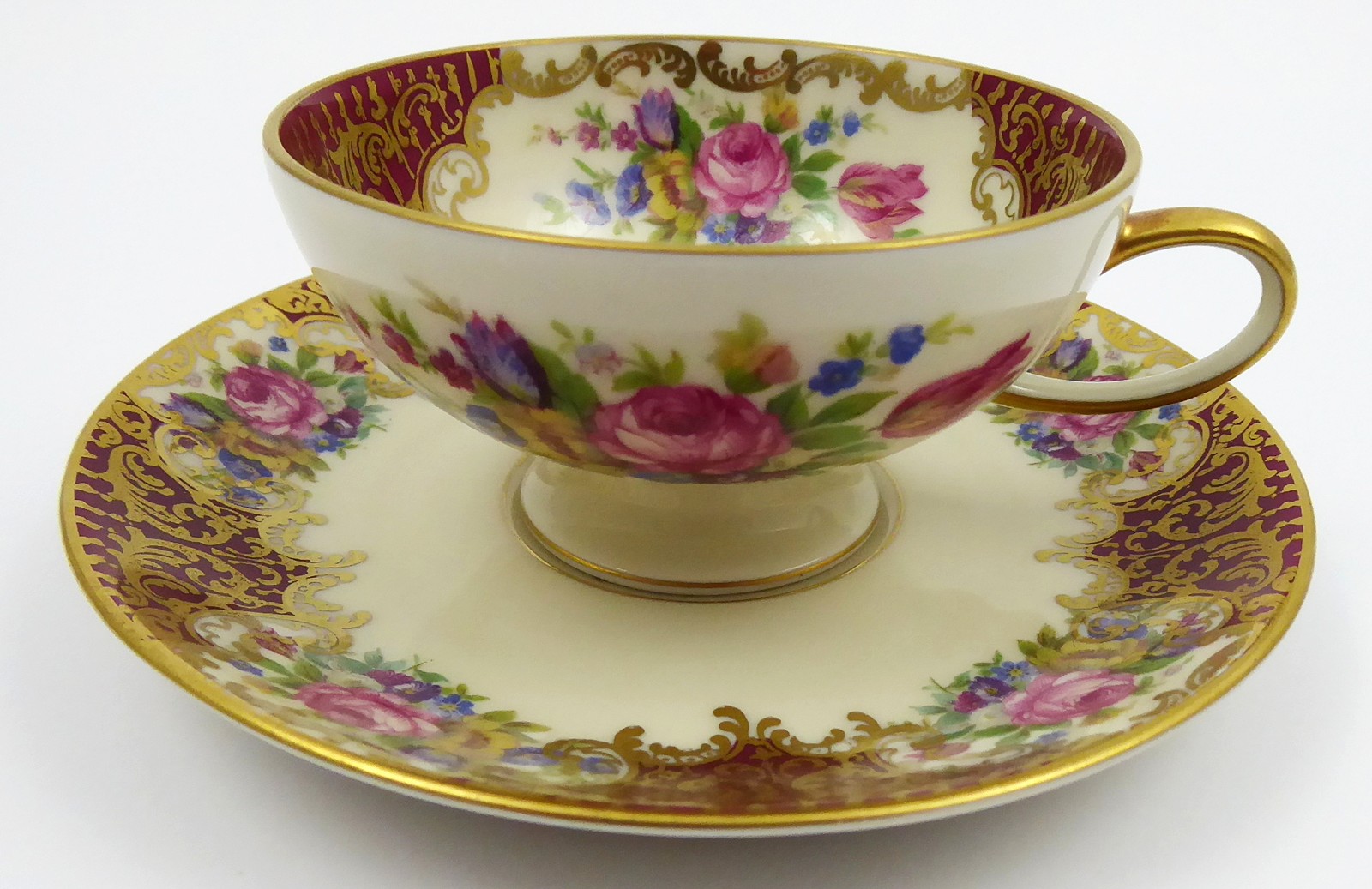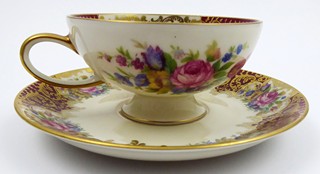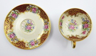 Německo, Rosenthal, 40. léta minulého století. Slonovinový, karmínový, barevný a zlacený porcelán. Porcelánka Rosenthal. Výška šálku 4,5 cm, průměr podšálku 11,5 cm. Kávový šálek slonovinové barevnosti miskovitého tvaru na kulaté nožce. Šálek i podšálek zdoben karmínovými poli střídajícími se s květinovými ornamenty. Doplněno zlacením. Značeno zespodu: firemní značka odpovídající danému období a čísla.
