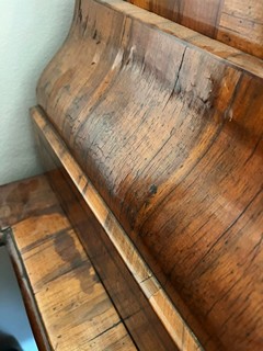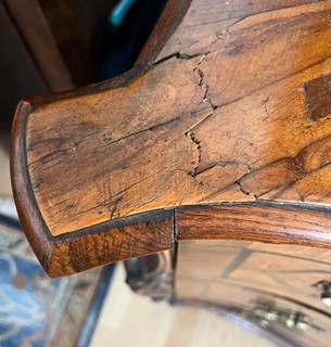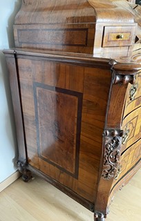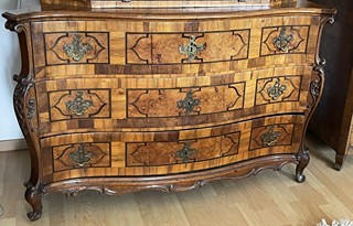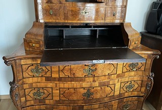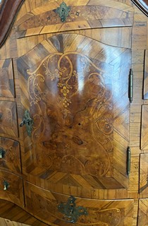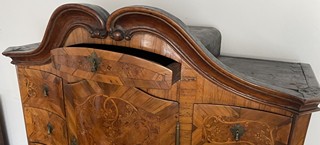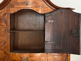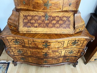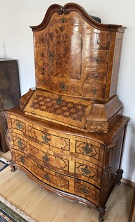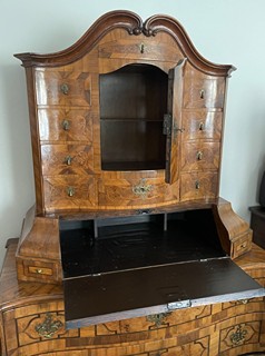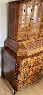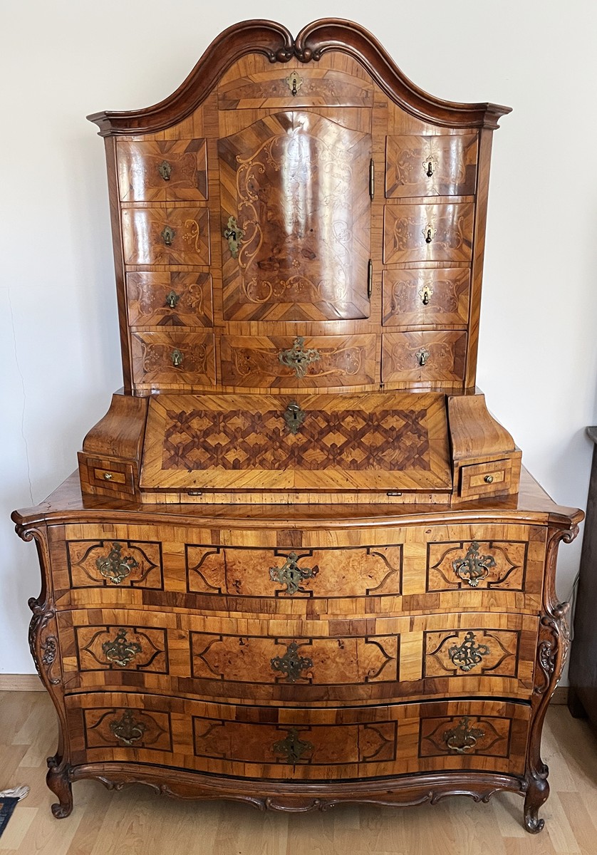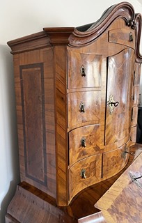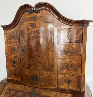 Střední Evropa 1720 - 1760. Ořechová dýha, javor, černěná hruška, švestka, bahenní dub, řezba. Období a styl: vrcholné baroko. Výška 205 cm, šířka 140 cm a hloubka 68 cm. Působivý barokní tabernákl (sekretář) výjimečný kvalitou řemeslného zpracování s důrazem na barokní tvarosloví. Horní část se skříňkovou nikou a deseti menšími šuplíky zakončená barokně klenutou mírně předsazenou římsou s řezbovanou volutou na vrcholu. Střední část s odklopnou psací deskou uvnitř vyloženou tmavou kůží. Postranní malé šuplíčky pod baldachýnovitě tvarovanou částí. Spodní část elegantně tvarovaná s předními ručně řezbovanými prostorově vyváženými polosloupky s motivy rokaje a mušle. Čela tří šuplíků barokně konvexně a konkávně tvarovaná. Čtyři stylové nožky a spodní část s řezbou rokaje. Sekretář zdobený světlou intarzií s florálními motivy v horní části a ve střední části s motivem mřížky. Spodní část s intarzovanými orámovanými poli se stylizovanými kartušemi. Na bočních stranách pásková intarzie. Uvnitř niky pozdější úpravy. Originální prořezávané mosazné kování s úchyty.