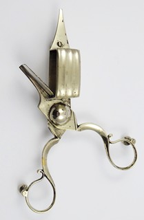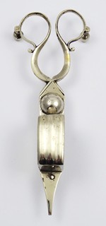 Evropa 1840 - 1890. Světlý kov. Délka 17 cm. Nůžky na zkrácení knotu svíček tzv. kratiknot. Nůžky s praktickými třemi kulatými nožičkami na postavení na stůl kvůli zabránění případného oděru nábytku. Zajímavý sběratelský kousek. Značeno: šlechtickým vlastníkem písmena WT s korunou (možné i logo výrobce).