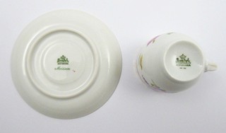 Německo, Rosenthal 1920 - 1932. Bílý, barevný a zlacený porcelán. Porcelánka Rosenthal. Název vzoru: Meissen. Výška šálku 6 cm, průměr podšálku 11 cm. Elegantní kávový šálek z bílého, barevného a zlaceného porcelánu. Dekorovaný barevnými květinovými vazbami, zlacenými girlandami a linkami. Značeno zespodu: dvě firemní značky platné pro dané období, název vzoru Meissen a číslo.