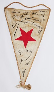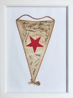 Československo, přelom 60. až 70. let minulého století. Vlajka z látky, střapce, rám, sklo. Výška vlaječky 22 cm, obraz se sklem 33 cm x 24 cm. Zarámovaná a zasklená malá vlajka fotbalového klubu SK Slavia Praha s vlastnoručními podpisy hráčů z přelomu 60. až 70. let. Z období, kdy například v roce 1967 Slávisté vyhráli finále Rubinsternova poháru v Tel Avivu pod vedením trenéra Františka Havránka. V té době hráli v sestavě sešívaných z Edenu např. Ledecký, Lála, Linhart, Tesař, Hildebrandt, Jozef Morávek, Nepomucký, Píša, Šimek, Vokáček, Veselý či V. Bouška. Zarámováno a se sklem.