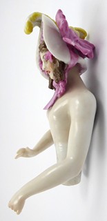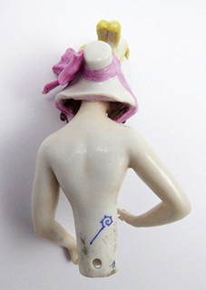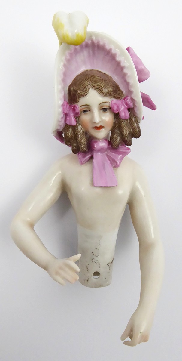 Německo, Passau 1907 - 1922. Bílý a ručně barevně malovaný porcelán. Porcelánka Dressler, Kister & Co., Passau (Pasov). Výška 13 cm. Porcelánová polopostava dívky ve vysokém klobouku s růžovými mašlemi a peřím. Obličej dívky ručně malovaný. Tzv. čajová panenka, jež sloužila jako ozdobný kryt na čajovou konvici. Na konci trupu dívky dírky k přišití látkové sukně. Zajímavý sběratelský kousek. Značeno zespodu: modrá biskupská hůl (berla).