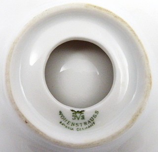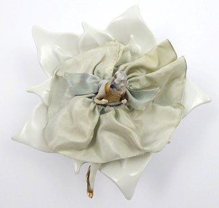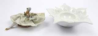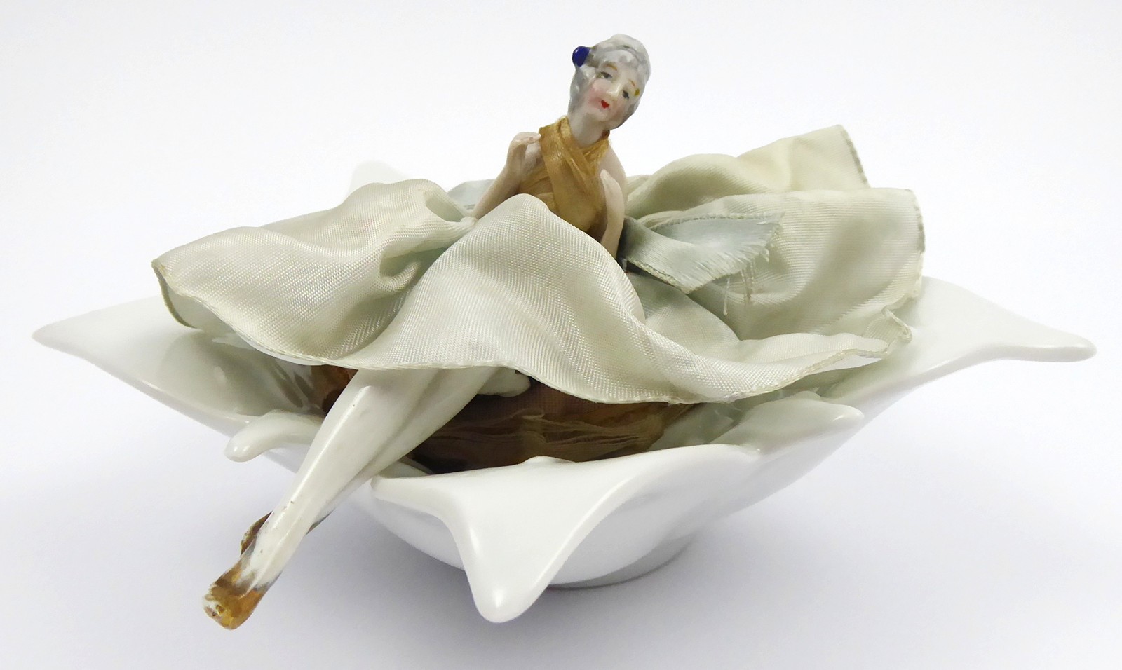 Německo 1920 - 1940. Bílý, ručně barevně malovaný a zlacený porcelán, látka. Významná bavorská porcelánka Johann Seltmann Vohennstrauss. Průměr misky 16 cm. Ojedinělá porcelánová miska ve tvaru stylizovaného květu s rozevřenými okvětními lístky s látkovým víkem korunovaným porcelánovou figurkou dívky v široké sukni. Dívčin obličej i vlasy ručně barevně malované. Střevíce zlacené. Nádobka v misce sloužila buď na drahý šperk či pudr. Zajímavý sběratelský kousek. Značeno zespodu: firemní značka pro dané období.