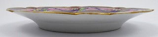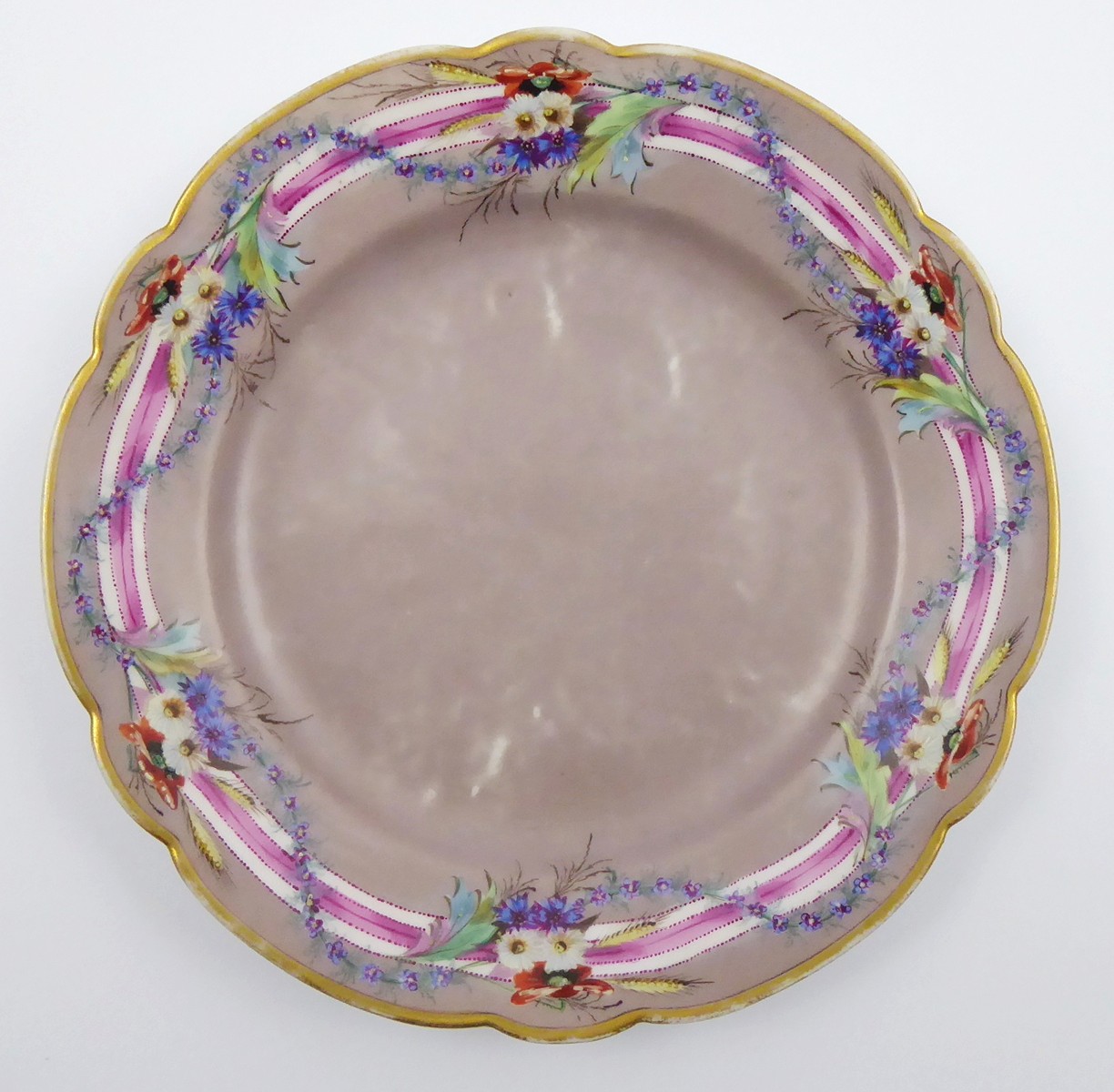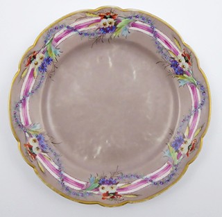 Čechy, Slavkov (Schlaggenwald) 1840 - 1870. Bílý, ručně barevně malovaný a zlacený porcelán. Slavná porcelánka ve Slavkově. Průměr 20 cm. Porcelánový talířek pastelové hnědošedé barevnosti s prolamovaným okrajem. Ručně dekorovaný girlandami s něžnými květinovými vazbami a bílorůžovou stužkou. Okraj talíře zlacený. Značeno zespodu: vtlačené písmeno S a čísla.