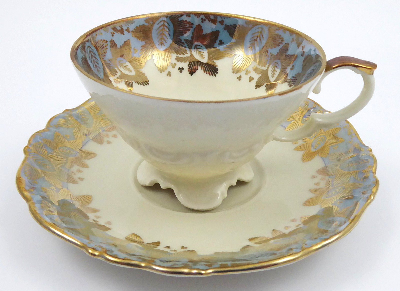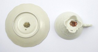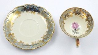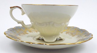 Německo, Kirchenlamitz 1920 - 1930. Bílý, barevný a zlacený porcelán, perleť. Výška šálku 6,5 cm, průměr podšálku 15 cm. Reliéfně tvarovaný čajový šálek s podšálkem dekorovaný zlacenými florálními ornamenty na perleťovém šedomodrém pásu. Uvnitř šálku květ růže se stonkem a listy. Značeno zespodu: firemní značka a nápis Bavaria, zlacené číslo.