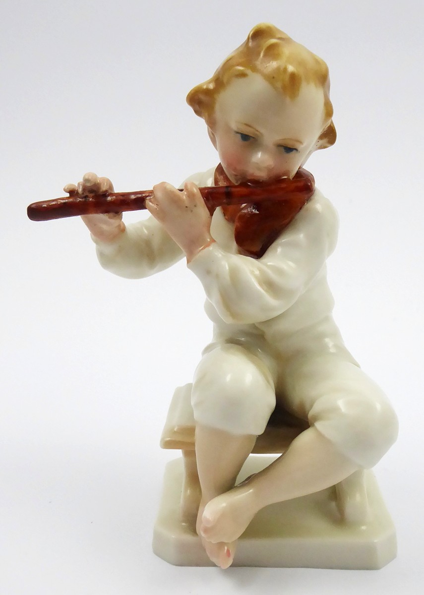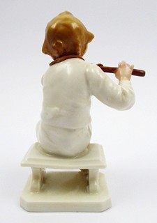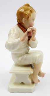 Německo, Volkstedt 1919 - 1945. Světle krémový a ručně barevně malovaný porcelán. Karl Ens, Volkstedt. Výška 12,5 cm. Figura malého chlapce ze světle krémového porcelánu. Kučeravý chlapec sedící na stoličce se šátkem uvázaným kolem krku a ručně malovaným obličejem hraje na příčnou flétnu. Značeno zespodu: firemní značka odpovídající danému období.