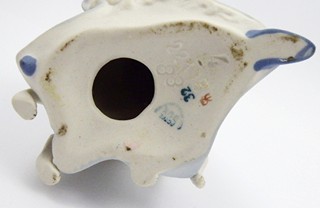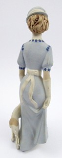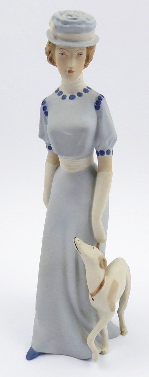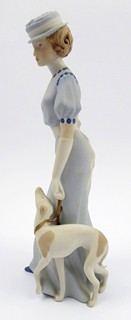 Československo, Duchcov 1960 - 1978. Dekorativní, ručně barevně malovaná porcelánová figura. Autor návrhu: Vladimír David (nar. 1921) - absolvent pražské UMPRUM spolupracující s Royal Dux, Duchcov. Výška 24,5 cm. Dáma v klobouku, šatech a s rukavičkami venčící malého chrta. Značeno zespodu: firemní značka, vtlačená čísla, tištěná čísla a značka malíře.