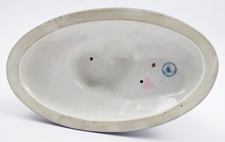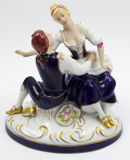 Československo 1970 - 1992. Bílý a ručně barevně malovaný i zlacený porcelán. Royal Dux, Duchcov. Výška 19 cm. Porcelánové sousoší sedícího mladého páru při namlouvání. Obličeje mladého muže i dívky, jejich oblečení a doplňky ručně barevně malované a zlacené. Na oválném mírně reliéfním nízkém podstavci. Značeno zespodu: originální nálepek z růžové porcelánové hmoty, tištěná firemní značka a vtlačená čísla.