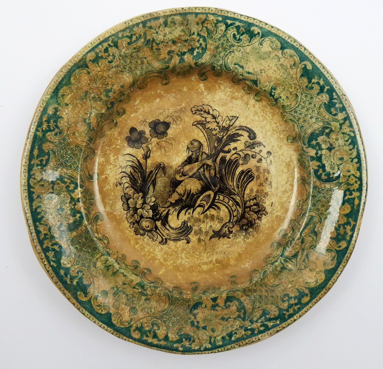 Čechy, Stará Role (Altrohlau) 1869 - 1890. Jemná kamenina s černým a zeleným podglazurním tiskem. Výzdoba talířku vychází z chinosérií s romantickým nádechem. Porcelánka Augustin Franz Nowotny, Altrohlau. Průměr 19,5 cm. Malý talíř z jemné kameniny na okrajích bohatě zdobený zelenou bordurou s kartušemi, mřížkováním a květinovým ornamentem. Centrálním motivem je Číňan sedící uprostřed stylizované bujné zeleně a hrající na strunný nástroj. Značeno zespodu: vtlačená značka NOWOTNY ALTROHLAU.
