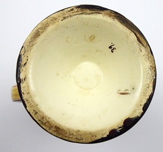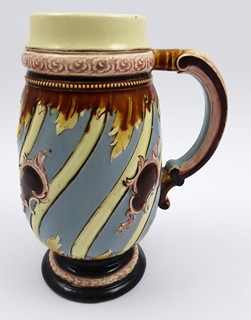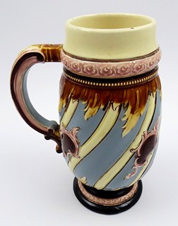 Morava, Znojmo 1880 - 1900. Ručně malovaná keramika. Rudolf Ditmar, Znojmo. Výška 22 cm. Keramický korbel ze světlé keramiky zdobený na obvodu reliéfními kartušemi na těle barvy holubičí šedi. Dekorativnost korbelu podtrhují věnečky s florálními ornamenty a punktováním. Uvnitř korbelu ručně psaná značka: -1L, představující objem jednoho litru. Korbel zakončen kulatou nižší patkou. Značeno zespodu: nezřetelná vtlačená firemní značka a čísla.