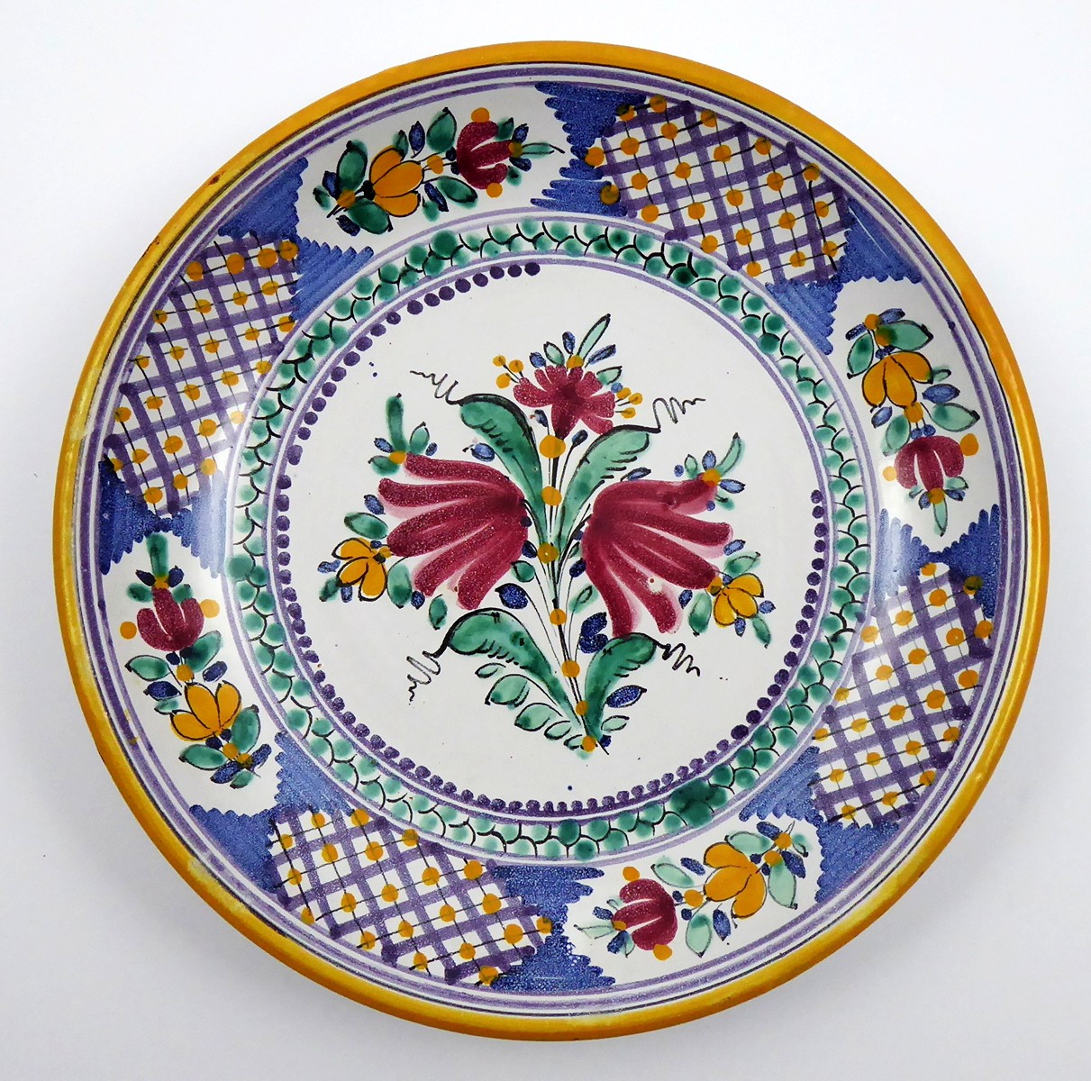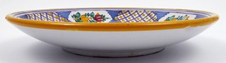 Západní Slovensko, Modra, po roce 1945. Ručně malovaná fajáns.Slovenská keramika Modra. Průměr 23,5 cm.Fajánsová závěsná mísa ručně malovaná oxidy kobaltu, mědi, manganu a antimonu. Na zrcadle mísy kolem centrálního motivu stylizovaných květů ohraničených punktováním a linkami zdobí okraje dekorativní mísy kartuše s florálními ornamenty střídající se s mřížkováním. Silnější žlutá linka pak ohraničuje vnější okraj. Vzadu úchyt na závěs. Značeno zespodu: vtlačené SLOVENSKÁ KERAMIKA MODRA a černě ručně psané MODRA.