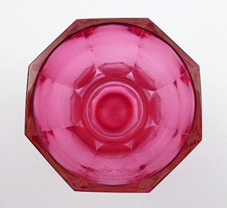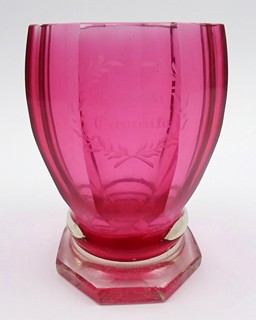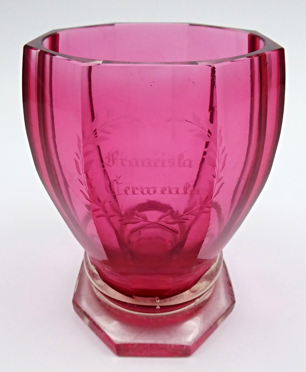 Čechy 1860 - 1880. Čiré a rosalinové ručně broušené sklo. Výška 13 cm. Pohár či sklenice z čirého skla podjímaného růžovým rosalinovým sklem. Pohár se svislými fazetami a hraněnou patkou centrálně zdobí ryté jméno "Františka Červenka" ve florálním věnečku.