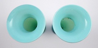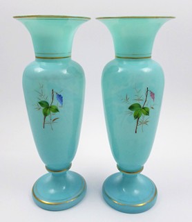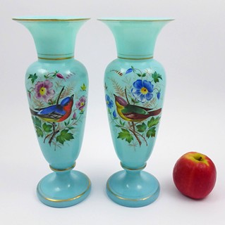 Čechy 1865 - 1885. Tyrkysově modré opálové sklo, ručně malované barevnými emaily, zlacené. Vázy připomínající produkci slavné sklárny Nový Svět v Harrachově. Výška obou váz 32 cm. Párové vázy elegantní linie z opálového skla krásné tyrkysově modré barevnosti zakončené nízkou kulatou patkou. Ručně emailovými barvami dekorované opeřenci z řad zpěvného ptactva, jež sedí na větvičce na pozadí pestrobarevných květenství. Zdobnost váz je doplněna zlacenými linkami.