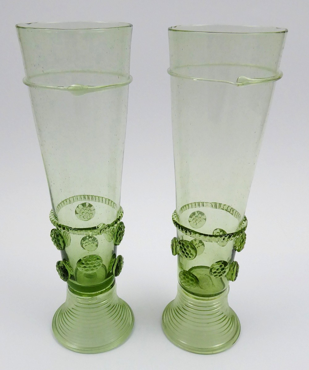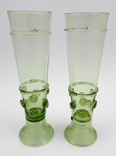 Čechy, přelom 20. a 21. století. Ručně foukané světle zelené lesní sklo. V renesančním stylu. Výška obou pohárů 24,5 cm. Dva poháry renesanční podoby z ručně foukaného světle zeleného lesního skla na vyšší žebrované kulaté patce. Nálepy rovněž z lesního skla ve formě prstenců, nití a kulatých útvarů stylizovaných do podobenství plodů ostružin či malin.