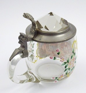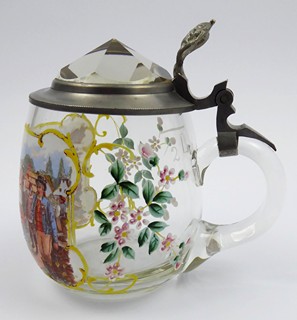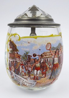 Čechy 1900 - 1940. Bezbarvé sklo, barevně tištěné a emailovými barvami malované, cín. Výška 15 cm. Skleněný korbel s hlavním barevně tištěným motivem z duetu Jeníka a Kecala z opery od Bedřicha Smetany Prodaná nevěsta. Centrální výjev obklopují ručně emailovými barvami malovaná kvítka s listy. Cínové víčko s opěrkou na palec korunované skleněným krystalem.