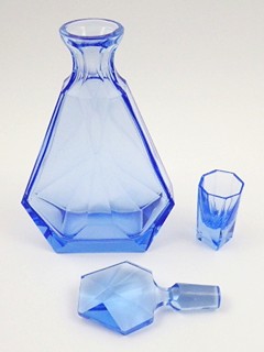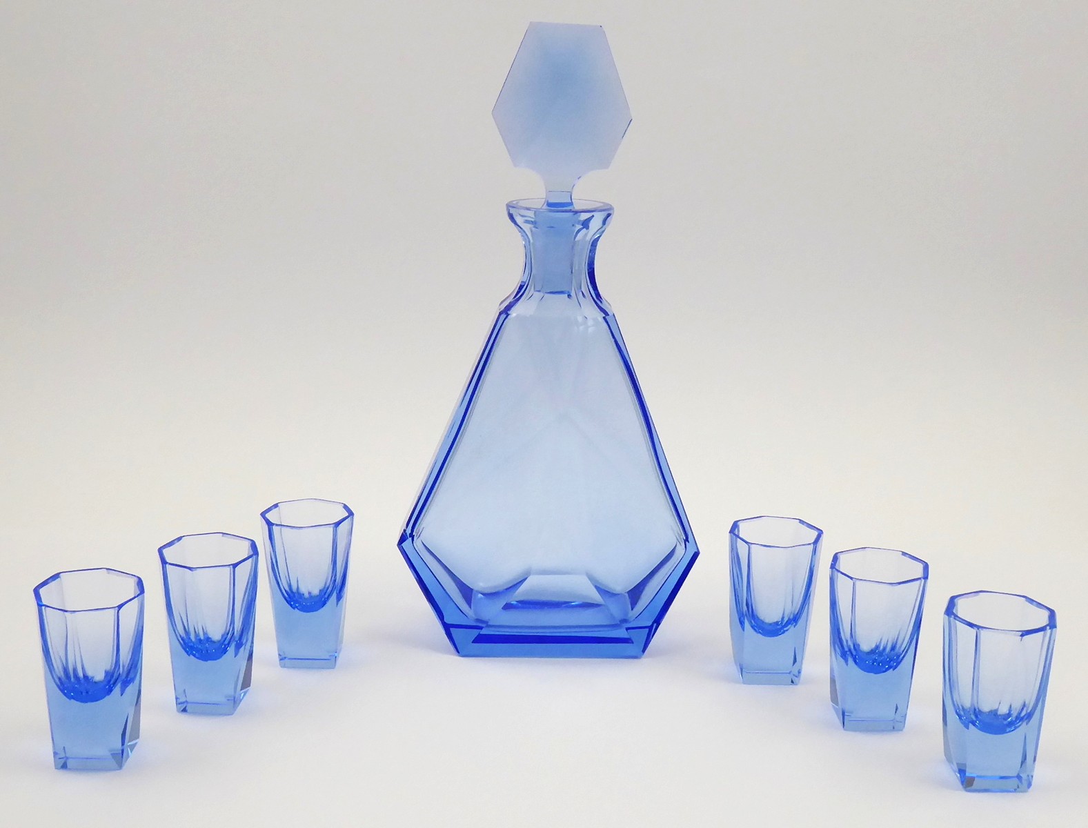 Československo 1925 - 1940. Modré akvamarínové ručně broušené sklo. Období a styl: art deco. Zřejmě produkce sklárny Josef Riedel v Jizerských horách ve 30. letech minulého století. Celková výška karafy 27 cm, výška karafy bez zátky 20 cm. Výška skleniček - odlivek 7 cm. Souprava art deco karafy a šesti skleniček z akvamarínového skla působivé modré barevnosti. Karafa s vysokou zdobnou zátkou a skleničkami s ručně broušenými fazetami geometrických tvarů.