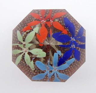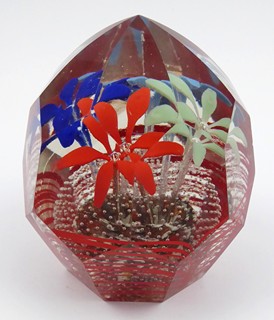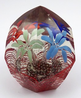 Československo 1920 - 1940. Ručně broušené čiré a barevné sklo. Výška 10 cm. Skleněné těžítko zdobené po obvodu ručně broušenými fazetami různých tvarů. Uvnitř barevná kvítka s korálkovými středy a ve spodní části pás bublinek. Oťuky po obvodu.