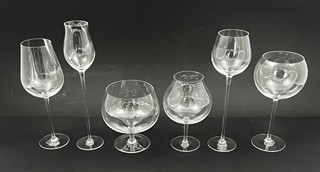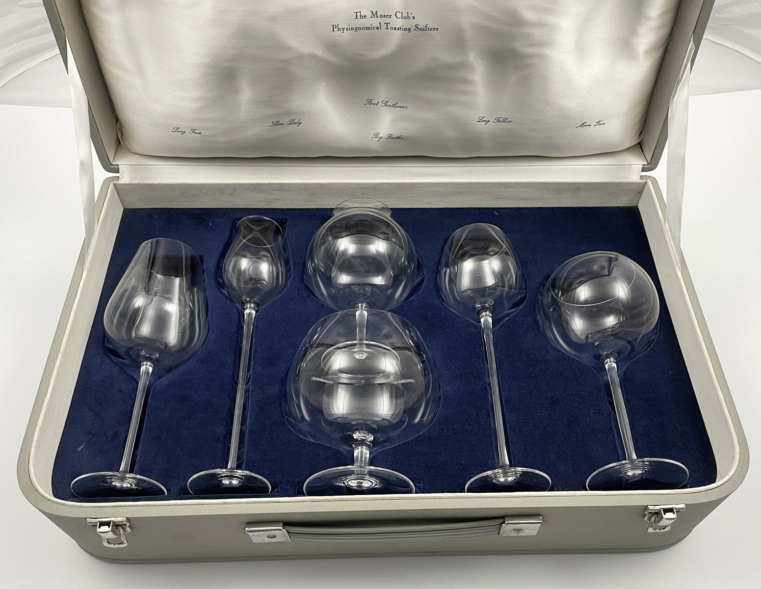 Československo, Karlovy Vary, od roku 1957. Křišťálové sklo. Autor nápadu na kolekci obřích číší ke 100. výročí založení firmy Moser a zároveň i autor návrhu jejich designu: František Chocholatý (1902-1973). Návrh z roku 1957. Název kolekce obřích číší: Fyziognomický bar. Tato kolekce proslula na Světové výstavě EXPO konané v roce 1958 v Bruselu. Podle této kolekce šesti osobitých obřích číší pojmenovaných Štíhlá dáma, Tlouštík, Tlustá Berta, Měsíční tvář, Dlouhý pán a Optimista vznikl v roce 1960 i Mezinárodní klub obřích číší. Každý zájemce o klubové členství si musel vybrat jednu ze šesti obřích číší, jež odpovídá jeho typu osobnosti. A absolvoval vstupní zkoušku, při níž se budoucímu členovi muselo podařit do roztočené obří číše nalít alespoň pár kapek aperitivu typického pro Karlovy Vary - Becherovky. Členství v tomto klubu získali světově známé osobnosti např. herec Robert Redford, muzikant Louis Armstrong, herečka Sophia Loren či španělský král Juan Carlos I. Kolekce šesti obřích číší z křišťálového skla pouze v poloviční velikosti od těch originálních velmi rozměrných. Výška jednotlivých číší: Long Fase 22,5 cm, Slim Lady 26,5 cm, Stout Gentleman 16 cm, Big Bertha 13 cm, Long Fellow 24,5 cm a Moon Face 20 cm. V rozměrné luxusní originální etui uvnitř s modrým nápisem BOHEMIA MOSER PRAHA, Copyright MOSER CZECHOSLOVAKIA, Author F.P. Chocholatý a centrálním zlatým logem ŠKODA a nápisem THE MOSER CLUB´S Physiognomical Toasting Snifters.