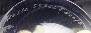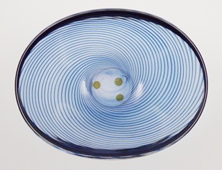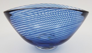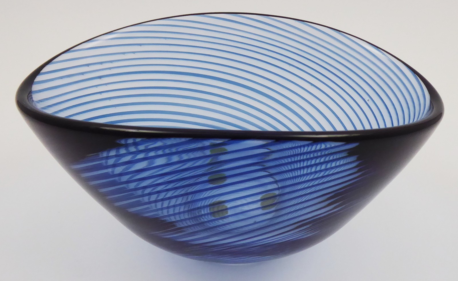 Švédsko, Kosta Boda, 70. až 80. léta minulého století. Bezbarvé křišťálové sklo, ručně hutně tvarované a ručně broušené. Signováno zespodu: KOSTA, EDENFALK, číslo modelu 58320. Autor: Bengt Edenfalk (1924-2016) pro Sklárnu Kosta Boda. Výška 10 cm, šířka 17 cm a hloubka 10 cm. Umělecká miska organického tvaru s modrými pruhy z modrého skla přejímaného bezbarvým křišťálovým sklem.