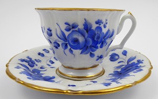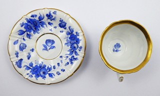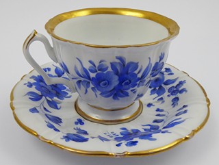 Čechy, Březová (Pirkenhammer) 1846 - 1859. Bílý, ručně modře malovaný a zlacený porcelán. Porcelánka Christian Fischer, Pirkenhammer. Výška šálku 7 cm, průměr podšálku 15 cm. Šálek s lehce reliéfně prolamovaným designem zakončený nízkou kulatou patkou. Šálek s podšálkem dekorovaný elegantním motivem modrých stylizovaných květů na vnějších částech i uvnitř na dně šálku. Zdobnost doplněná širšími i úzkými zlatými linkami. Značeno zespodu: vtlačená písmena CF.