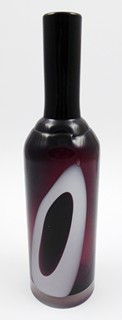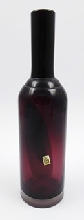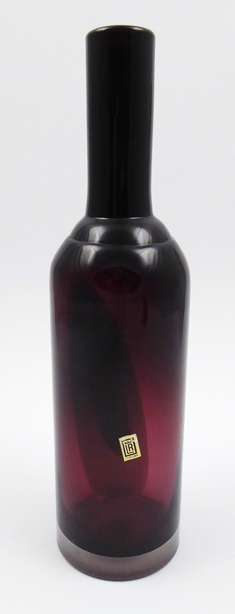 Československo, Lednické Rovne, 70. a 80. léta minulého století. Bezbarvé, opálové a tmavě fialové hutně tvarované sklo. Autor: Jarosla Taraba (1932-2020) pro Sklárnu Lednické Rovne. Výška 31 cm. Umělecká váza typu Sommerso z tmavě fialového skla s opálovým zataveným dekorem, přejímané křišťálově čirou sklovinou. Zespodu váza matovaná. Značeno originální nálepkou s emblémem výrobce a CZECHOSLOVAKIA.