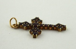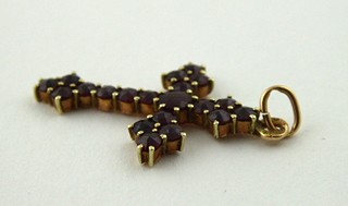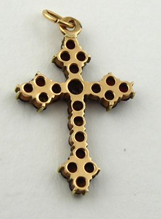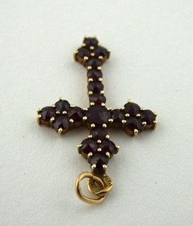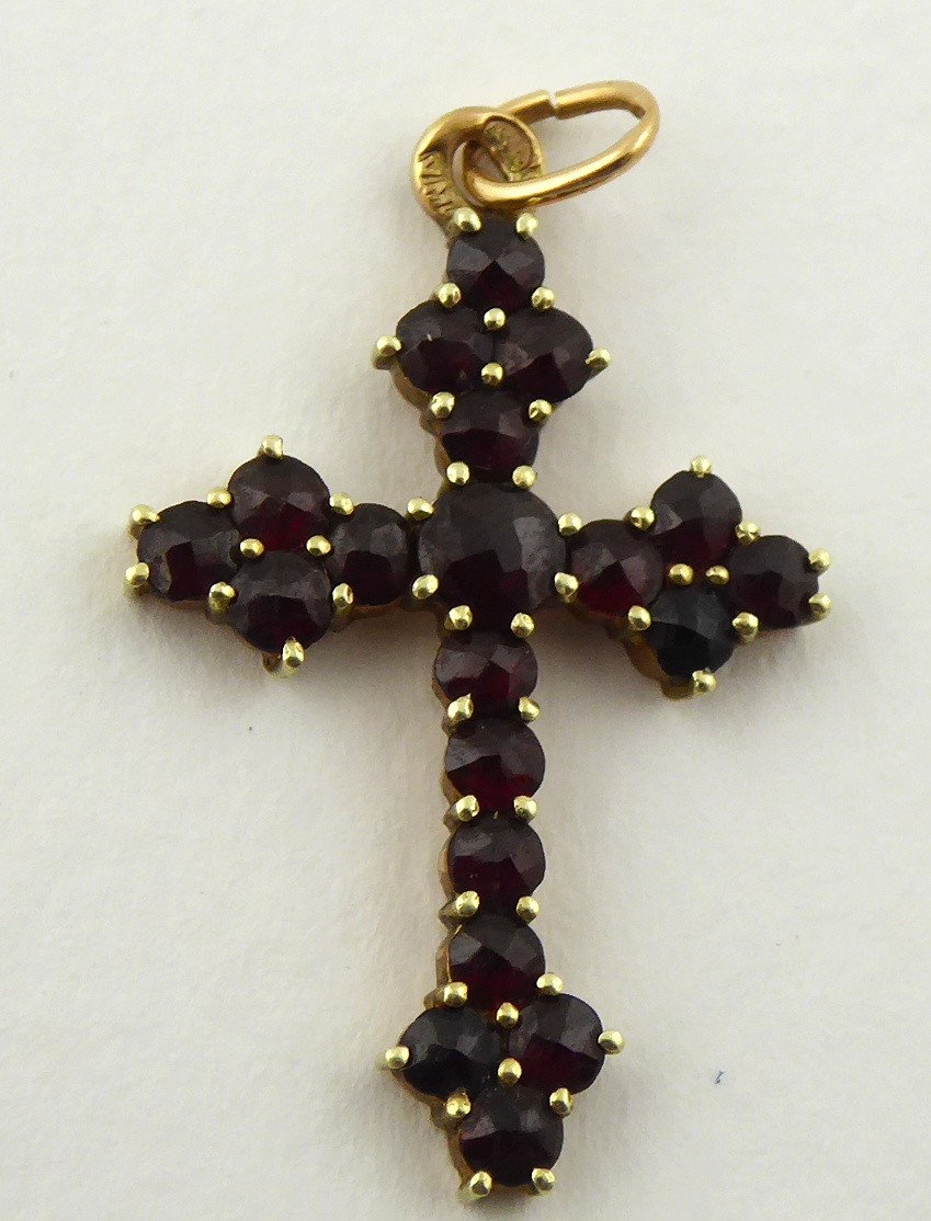 Československo, Praha 1929 - 1949. Čtrnáctikarátové zlato, přírodní české granáty. Zlatník Václav Martinů působící v Praze. Ryzost Au 585/1000, celková hmotnost 1,05 g. Celková výška přívěsku 30 mm, výška bez očka 27 mm. Zlatý křížek zdobený pravými českými granáty routového výbrusu. Značeno: mistrovská značka a československý punc lvíček.
