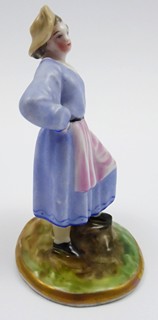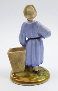 Čechy 1840 - 1870. Bílý, ručně barevně malovaný a zlacený porcelán. Výška 11 cm. Porcelánová figurka dívky ve venkovském dobovém oblečení a kloboučku, jež se levou rukou opírá o nůši a druhou ruku má podepřenou na boku. Na oválném nízkém podstavci stylizovaném do paloučku ohraničeném zlacenou linkou. Neznačeno.
