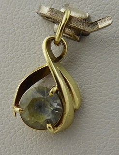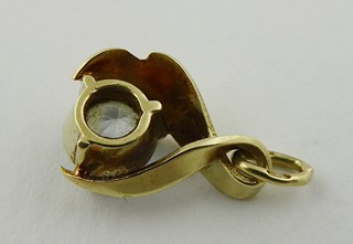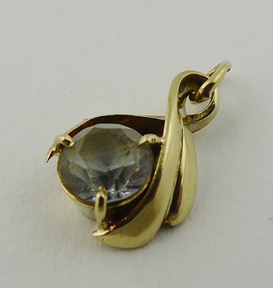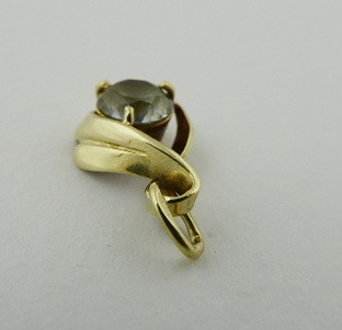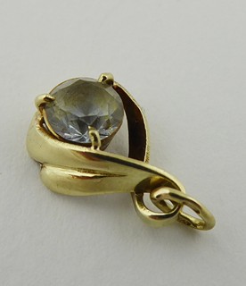 Československo 1953 - 1978. Čtrnáctikarátové zlato, zirkon. SAFINA, Praha - tehdejší národní podnik zlatníků a stříbrníků. Ryzost Au 585/1000, celková hmotnost 1,30 g. Celková výška přívěsku 15 mm. Drobný zlatý přívěsek ze zlata zdobený zirkonem. Značeno: československý punc čejka a mistrovská značka výrobce.