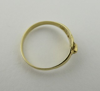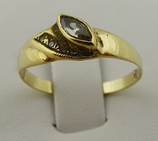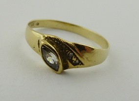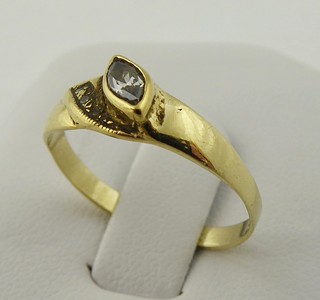 Česká republika, od roku 1993. Čtrnáctikarátové zlato, syntetický zirkon. Ryzost Au 585/1000, celková hmotnost 1,60 g. Velikost prstenu 53. Něžně vypadající zlatý prsten se syntetickým zirkonem ve tvaru slzy či kapky. Značeno: český punc labuť a mistrovská značka.