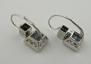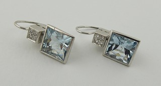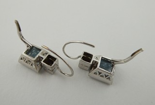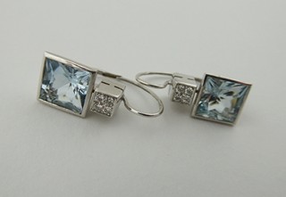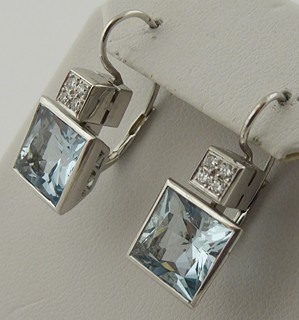 Evropa, poslední čtvrtina minulého století. Bílé osmnáctikarátové zlato, velké přírodní akvamaríny o celkové přibližné váze 6,95 ct a osm přírodních diamantů o celkové váze 0,15 ct, barva G a čistota Si. Ryzost Au 750/1000, celková hmotnost 7,80 g. Délka náušnic 25 mm, šířka 10 mm. Velmi poutavé visací náušnice větších rozměrů z osmnáctikarátového bílého zlata zdobené velkými přírodními ručně broušenými akvamaríny krásné světle modré barevnosti doplněnými o osm přírodních diamantů moderního briliantového brusu. Tyto náušnice atraktivního designu mají zapínání na klapku. Zdařilá klenotnická práce. Značeno: československý punc labuť.