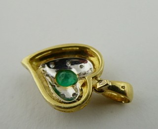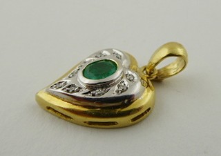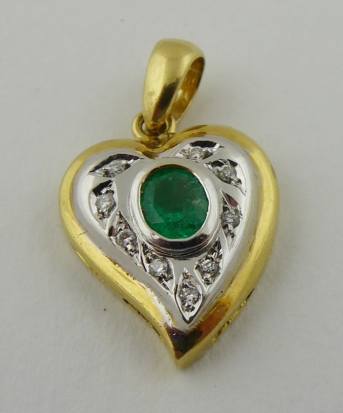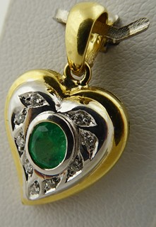Evropa, přelom 20. a 21. století. Žluté a bílé osmnáctikarátové zlato, přírodní smaragd a 9 přírodních diamantů o celkové váze 0,10 ct, barva G, čistota Si-P. Ryzost Au 750/1000, celková hmotnost 3,69 g. Výška přívěsku 25 mm, šířka 15 mm. Přívěsek v kombinaci bílého a žlutého osmnáctikarátového zlata ve tvaru stylizovaného srdce. Centrální přírodní smaragd pěkně syté jasně zelené barvy, inkludovaný a obklopený devíti malými přírodními brilianty. Značeno: československý punc kohout a ryzost 750.