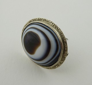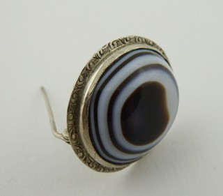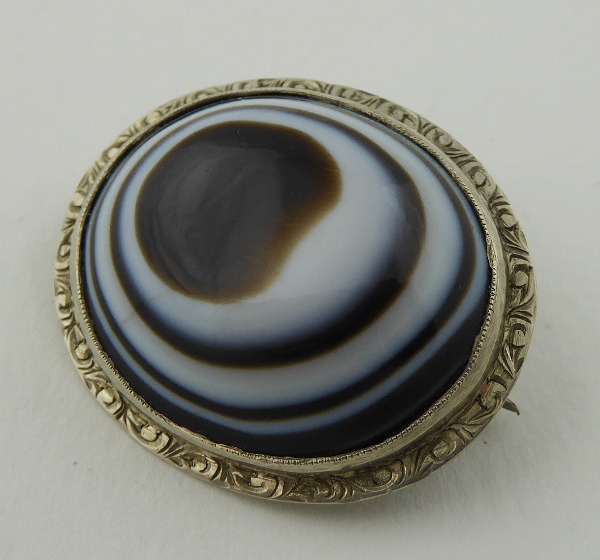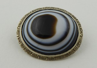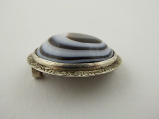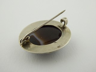Československo, od roku 1957. Stříbro, přírodní achát. Ryzost Ag 800/1000, celková hmotnost 9,25 g. Rozměr brože: 10 mm x 15 mm. Stříbrná brož s krásným přírodním leštěným achátem oválného vypouklého tvaru. Doplněno o gravírovaný ornament na obvodu. Značeno: československý punc zajíc, značka ryzosti 800.