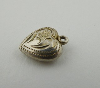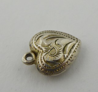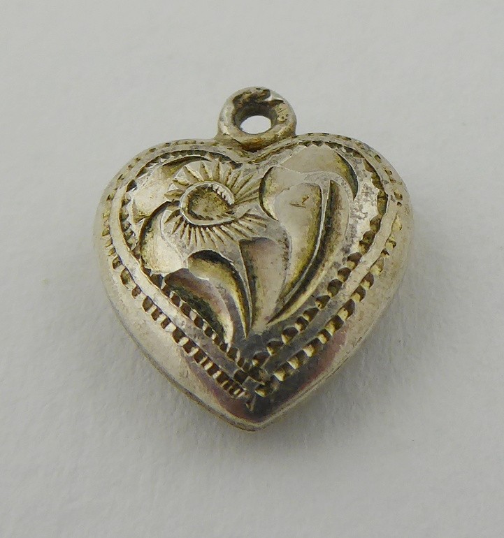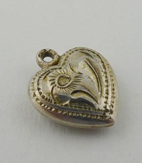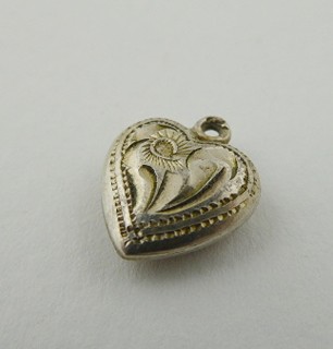 Československo, Jablonecko 1949 - 1957. Stříbro. Ryzost Ag 835/1000, celková hmotnost 0,9 g. Výrobce: Jablonecká Bižuterie, národní podnik sdružující stříbrníky a zlatníky po zrušení živností z let 1945 - 1951. Rozměr přívěsku: 10 mm x 10 mm. Malý přívěsek v podobě srdíčka ze stříbra s gravírovaným ornamentem. Značeno: československý punc kamzík a značka výrobce.