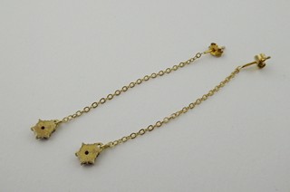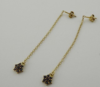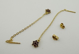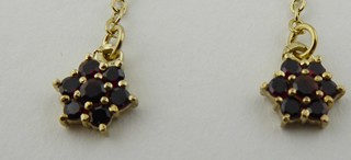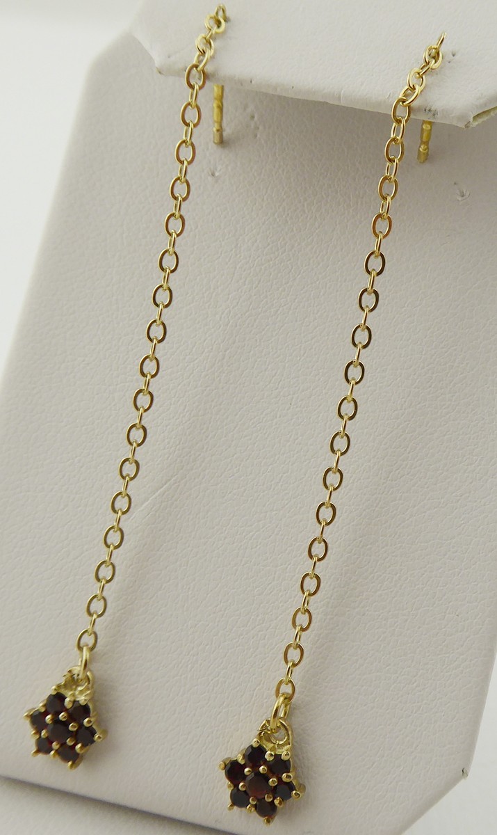 Česká republika, Turnov, přelom 20. a 21. století. Zlacené stříbro vysoké ryzosti, přírodní české granáty. Výrobce: Granát, Turnov - družstvo umělecké výroby. Ryzost Ag 925/1000, celková hmotnost 1,85 g. Délka náušnic 68 mm. Dlouhé visací náušnice ze zlaceného stříbra vysoké ryzosti zakončené drobnou kytičkou z pravých českých granátků. Náušnice mají zapínání na puzetu. Značeno: značkou výrobce a značkou ryzosti 925.