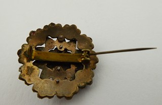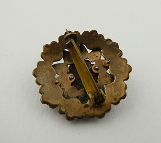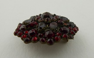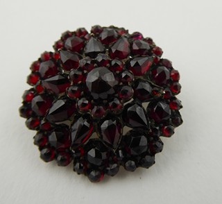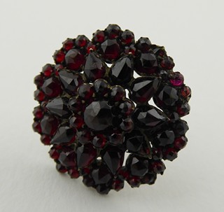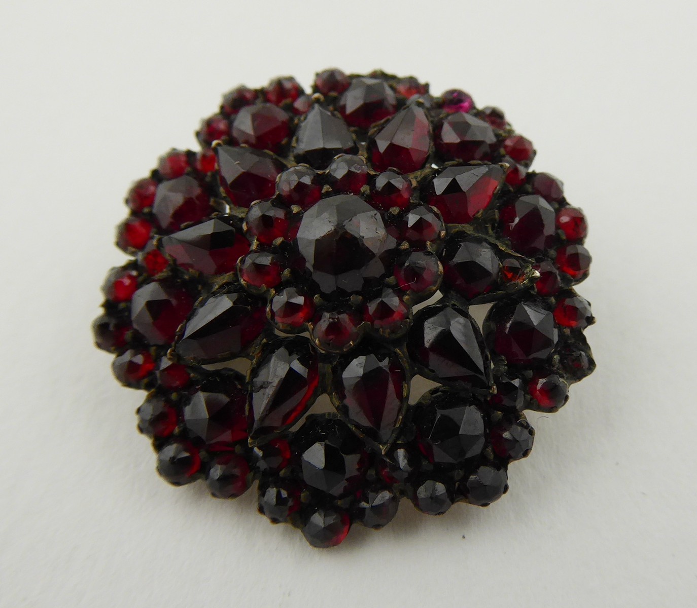 Čechy 1840 - 1870. Tombak a žlutý kov, přírodní české granáty. Průměr brože 27 mm. Brož v podobenství květu osázeného různě tvarovanými pravými českými granáty routového výbrusu zasazenými abdekovou technikou.