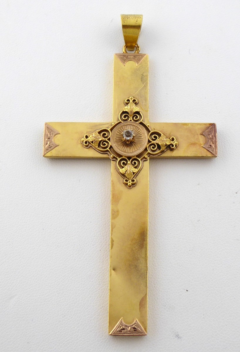Čechy, Praha 1866 - 1880 14 karátové zlato, čirý broušený skleněný kamínek Ryzost Au 580 / 1000, hmotnost 8,8 gramů Ve stylu pozdního biedermeieru Výška 93 mm Zlatý kříž klasického hladkého tvaru s čelními okraji zdobenými gravírovanými ornamenty. Na čelní straně reliéfní zdobný prořezávaný ornament. Uprostřed kulatý terč s broušeným čirým kamínkem. Značeno pražským rakousko-uherským puncem hlava lišky, mistrovská značka.