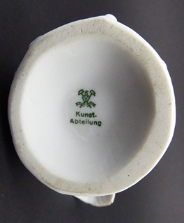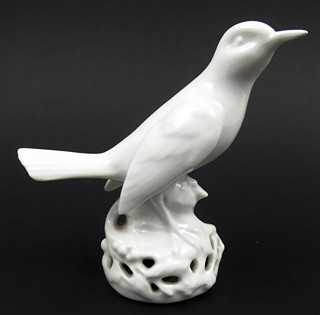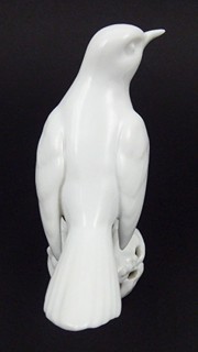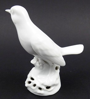 Československo 1920 - 1930. Bílý porcelán. Porcelánka v Březové (Pirkenhammer) patří k nejstarším v naší republice. Založil ji roku 1803 durýnský obchodník B. Höcke, o osm let později ji prodal J.M. Fischerovi. Společnost provozovala i umělecké oddělení s designovými výrobky, patří mezi ně i tato ptačí figura. Výška 12 cm. Elegantní bílá porcelánová soška špačka odpočívajícího ve větvoví. Značeno zespodu: firemní značka a německý název Kunst-Abteilung (umělecké oddělení).