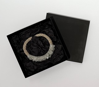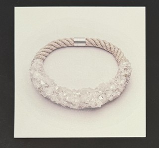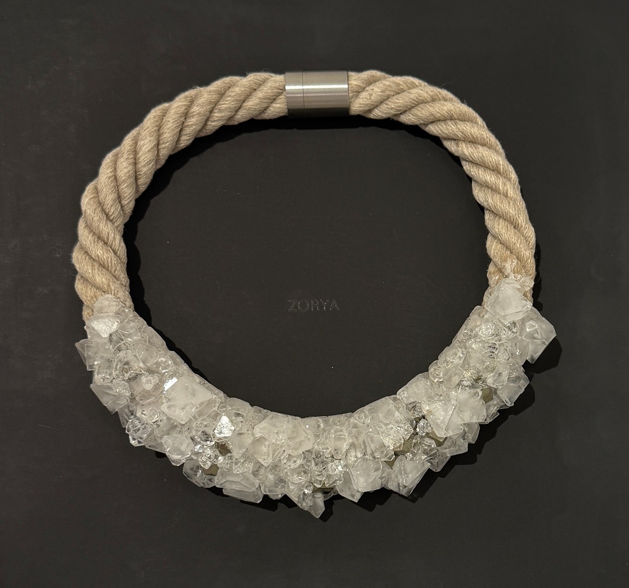 Výrazný náhrdelník značky Zorya vyrobený z lněného lana, bílých krystalů s magnetickou sponou z nerezové oceli. Originální balení. Původní cena 18.600,-
