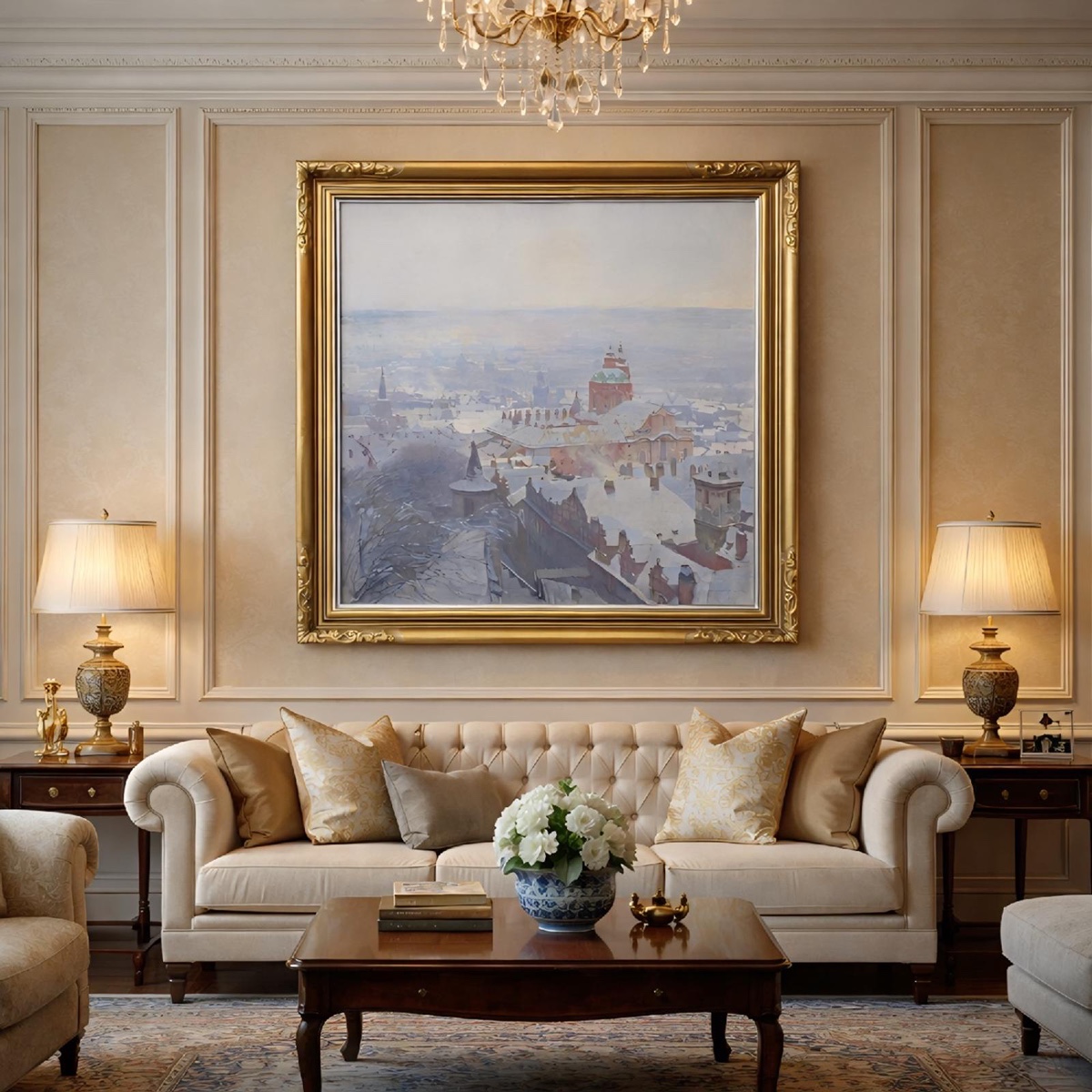 Obraz vyniká kultivovaným malířským rukopisem, citlivou prací se světlem a výrazným smyslem pro prostor a městskou scenérii. Zasněžené střechy a jemný opar nad městem dodávají dílu hloubku a nadčasový charakter. Jedná se o mimořádně kvalitní galerijní práci velkého formátu, která přesahuje běžnou autorovu produkci.