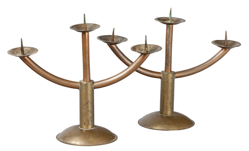 Funkcionalistické svícny – 2 ks|Čechy, 30. léta 20. stol., okruj J. Vaňka, mosaz, obecný kov, velké stolní svícny funkcionalistického tvarosloví, 2 ks, výška 31 cm, pozdější opravy některých spojů
