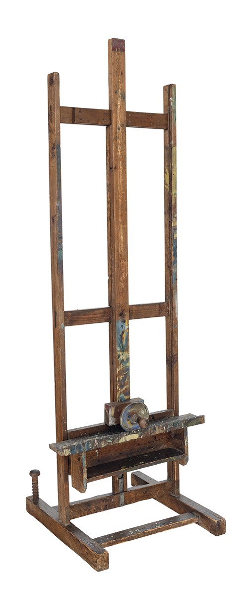 Čechy, 2. třetina 20. stol., mořené dřevo, obecný kov, polohovatelný stojan, původní stav, rozměr 57 × 53 cm × výška polohovatelná