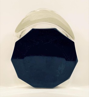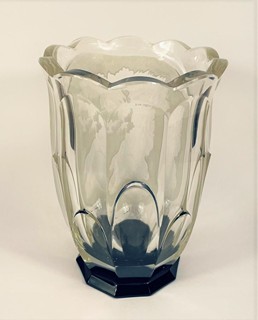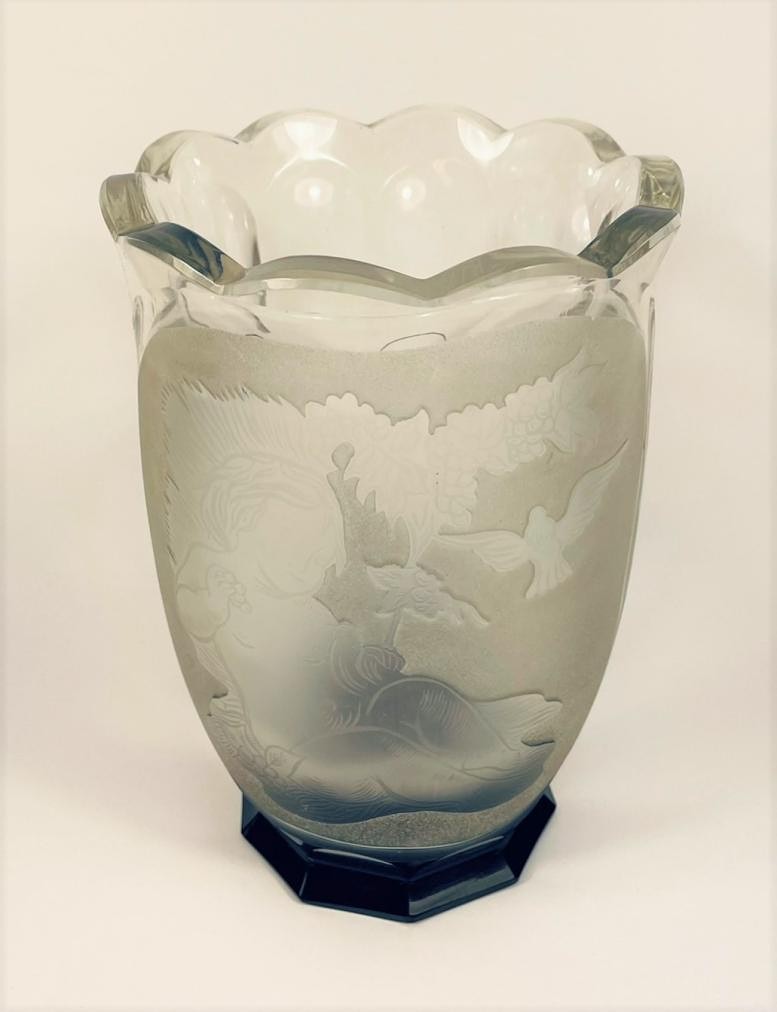 Výška: 18cm, v nejširším bodě: 12,5cm, kombinace leptaného a broušeného skla, motiv dítěte a holubice. Dno je z černého skla.
