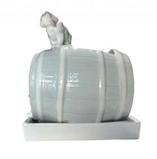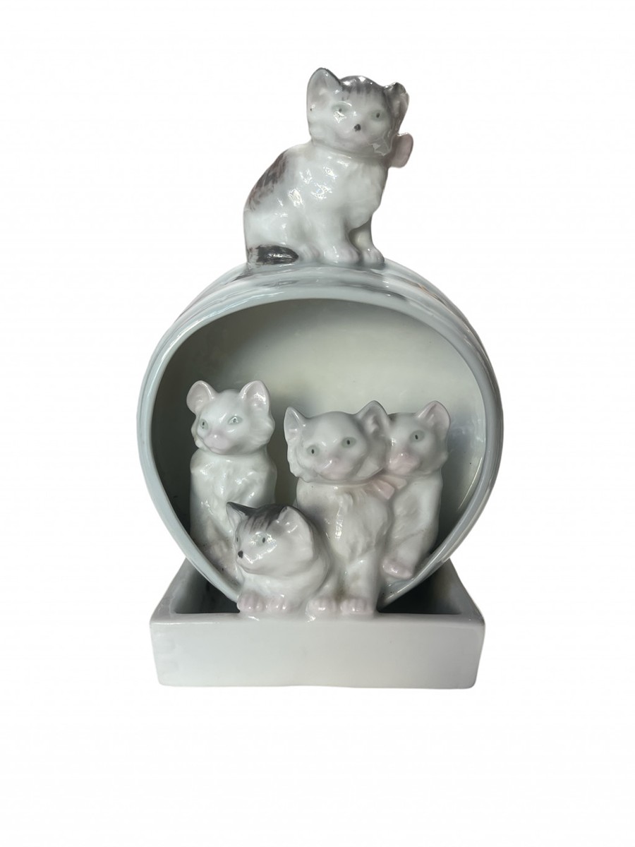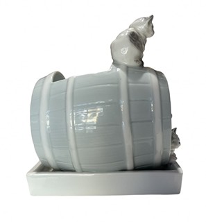 Porcelánové sousoší čtyř koček vykukujících ze sudu a jedné, která sedí na něm. V soudku je otvor, který se dá využít jako váza na květiny. Celková výška je 17,5 cm, šířka je cca 14 cm a hloubka/tloušťka je 15 cm. Ve skvělém stavu, pouze kočka na sudu má téměř neznatelně odštípnutý malý kousek ouška. Neznačeno. A další širokou nabídku naleznete na www.graciano.cz