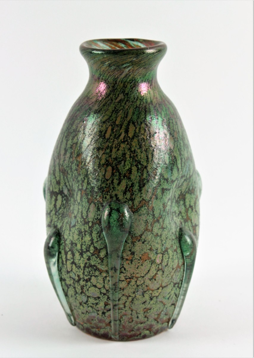 Čechy, okolo roku 1900, tělo vázy tvarované promáčknutím, zeleno-žluté sklo, irisovaný povrch, zdobeno šesti vertikálními nálepy, celkové rozměry 18,5 x 11 x 11,5 cm.