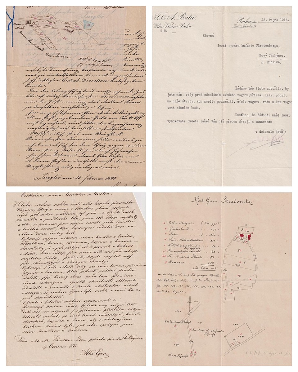 | popis | konvolut dokumentů a obchodní korespondence, 2x podpis M. E. Fürstenberg, doklady o stavu lesů, katastrální nákresy území a staveb, dopisy od firmy Baťa aj., r. 1860 - 1916, některé dokumenty jsou místy potrhané, dobrý stav |