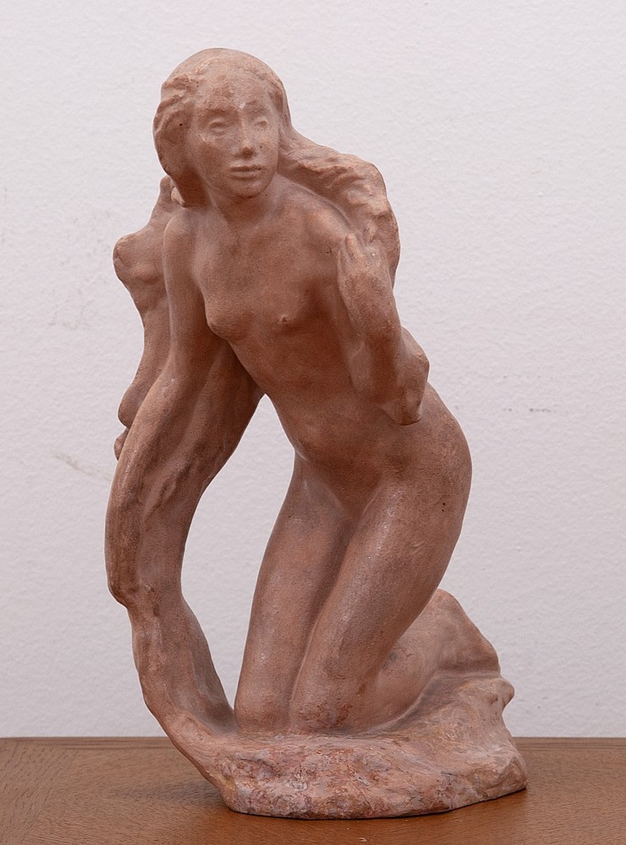 | popis | nabízená socha Před koupelí v moři, původně vytvořená Štursou v roce 1906, se vyskytuje v několika provedeních (mramor, bronz, keramika ad.). Naše verze pochází z neurčené keramické dílny dvacátých let, technika je litá keramická hmota do sádrové formy, po vypálení patinovaná. |