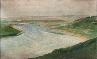 olej, plátno | 1905 | 17 x 27 | sign. PD M. Nesterov | rám | Michail Vasiljevič Něstěrov byl významný ruský malíř, klíčový představitel religiózního symbolismu. Jeho tvorba vyniká duchovní hloubkou a citlivostí k náboženským a filozofickým tématům, což ho řadí mezi nejvýraznější umělce své doby. Něstěrov studoval na carské akademii umění pod vedením Pavla Čisťakova a byl úzce spjat s hnutím peredvižniků (pocestní), které odmítalo akademismus a kladlo důraz na realistické ztvárnění života. V letech 1890–1910 žil a tvořil v Kyjevě a Petrohradě, kde pracoval na řadě významných náboženských projektů, včetně fresky pro chrám svatého Vladimíra v Kyjevě. Po roce 1910 se usadil v Moskvě, kde se věnoval portrétům významných osobností ruské kultury a vědy. Nabízený obraz představuje klidnou scenérii řeky, ztvárněnou Něstěrovým charakteristickým jemným a téměř éterickým stylem, dokonale vystihuje umělcovu hlubokou vazbu na duchovní a přírodní světy. Vlnící se kopce a tekoucí řeka evokují mírovou, téměř meditační krajinu, která vyzývá k zamyšlení. Něstěrov byl známý svými duchovními a náboženskými kompozicemi, a tento obraz subtilně odráží nadčasovou harmonii ruského venkova. Pravost obrazu byla ověřena PhDr. Michaelem Zachařem | oděrky na rámu
