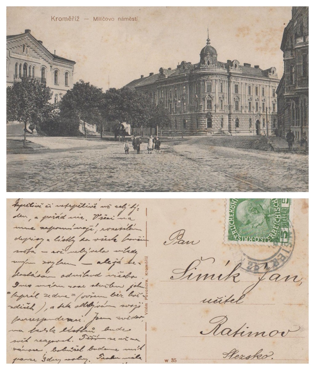 | stav díla | Vilém Povondra, Kroměříž, prošlá poštou, známka, razítko, r. 1912 |