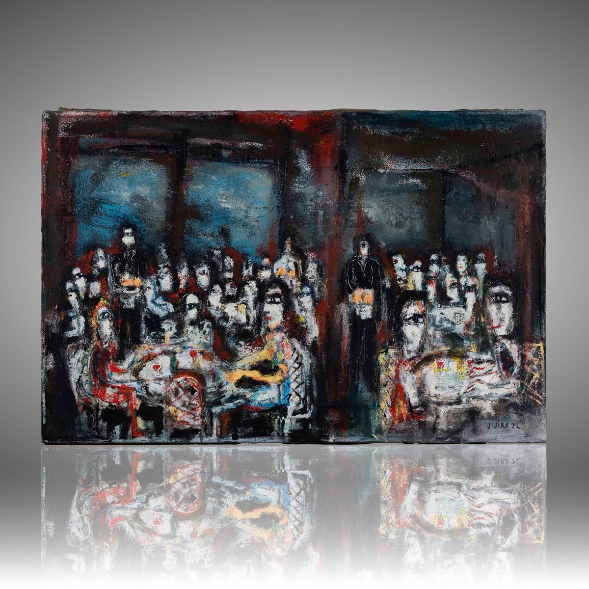 Předložený olej na plátně z roku 1972 je fascinující ukázkou vrcholného tvůrčího období Josefa Jíry, klíčové postavy české moderní malby a zakládajícího člena prestižní skupiny M 57. Dílo zachycuje autorův ikonický námět figurálního výjevu v interiéru, v němž Jíra s jemu vlastní expresivní dravostí transformuje všední situaci do hlubokého existenciálního dramatu. Malba je budována v hutných pastózních vrstvách s důrazem na psychologickou hloubku postav, jejichž stylizace odkazuje k autorovu proslulému cyklu „Oči“.